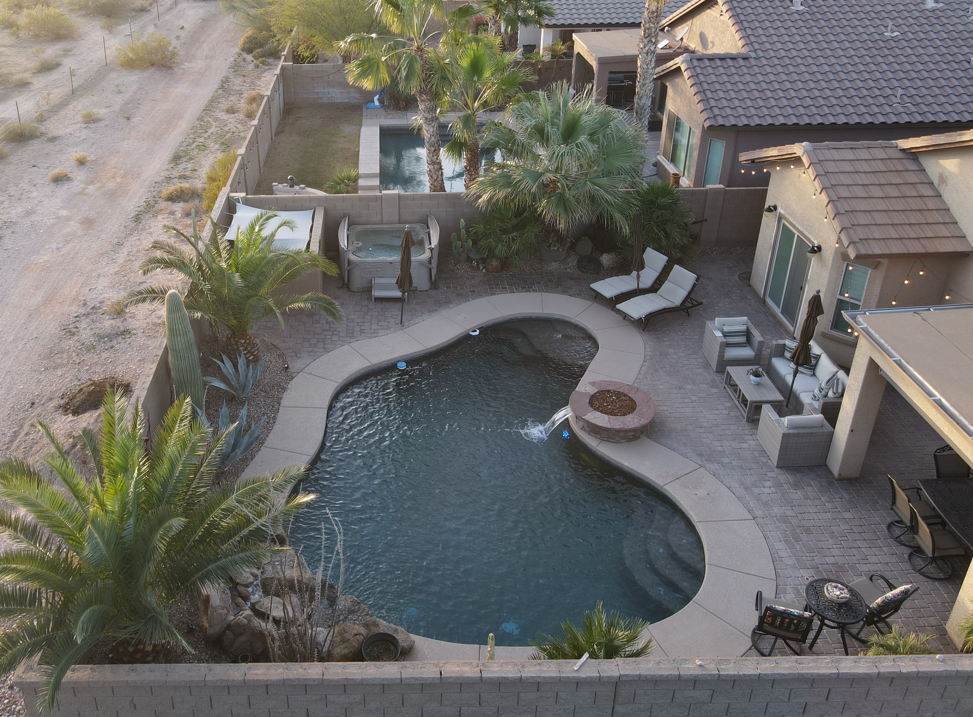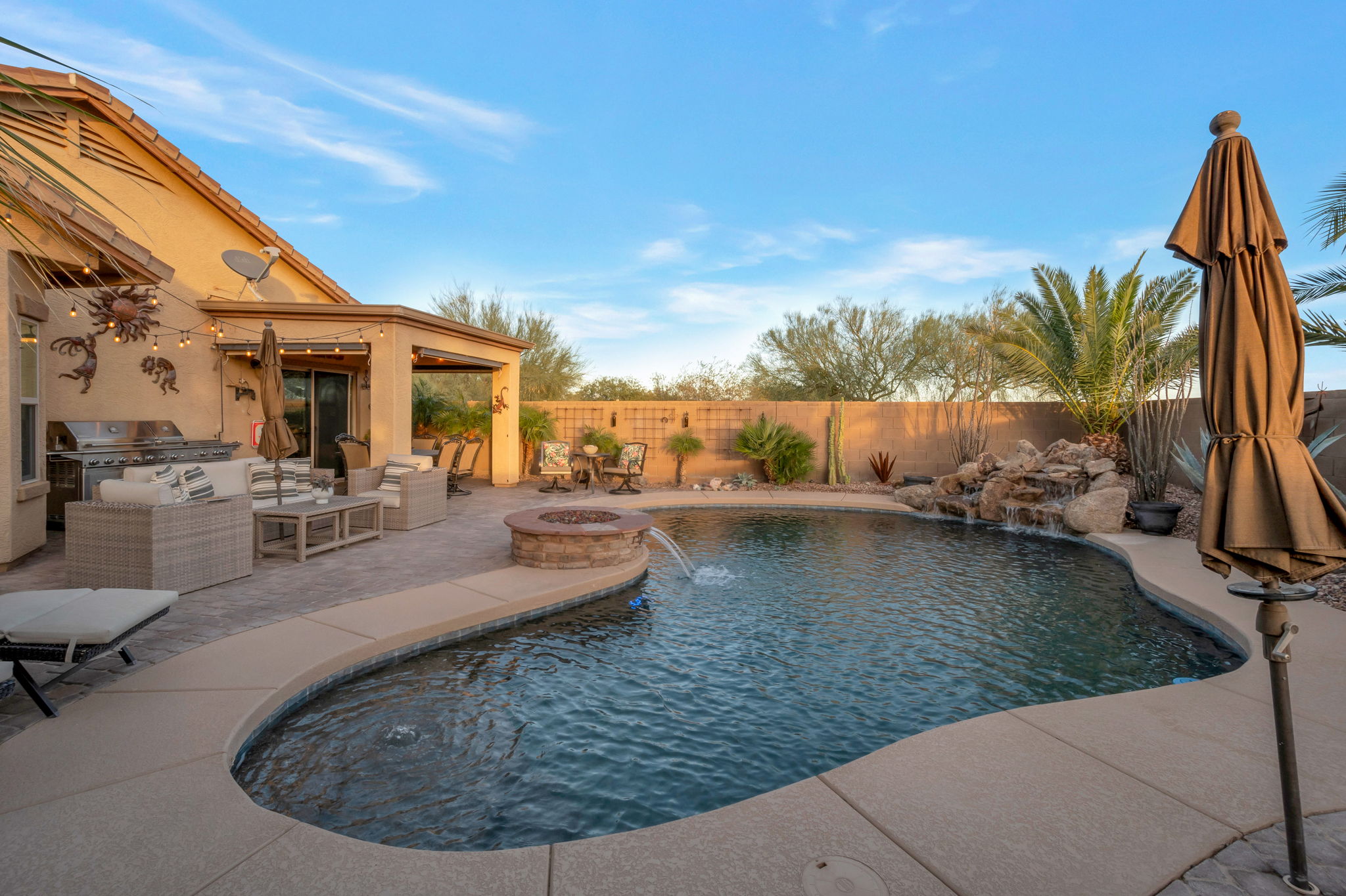 Prepare to be impressed. This home has everything. With no side or rear neighbor this premium lot offers both privacy and tranquility. Gently used for the last 15 years as a second home it is ready for a new owner and making new memories. This 1450sqft open floorplan has crownmolding throughout adding additional warmth and charm to this 3 bedroom 2 bath home. The 3rd bedroom is set up as a den with a murphy bed for the optimum use of space. The remodeled kitchen is in the center of the home making it the entertainment hub with granite counters, upgraded cabinets, stainless steel appliances with gas range, under and over cabinet lighting, reverse osmosis water and insta hot system. The master bedroom has a new slider offeting easy access to the outdoor paradise. The backyard has everything you need to entertaining or just relaxing enjoying the mountain views. The heated pool has both  gas and electric heaters for maximun effeciency, it also has a rock waterfall and an additionalwater feature pouring out of the gas firepit. There is also a hottub for additional enjoyment. With extra natural gas stubs, and extended paver patio this yard has it all. Anthem at Merrill Ranch community has a golf course with clubhouse, aquatic center, tennis and pickleball courts, fitness center and ponds.
